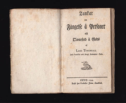 Tankar om Fängelse å Personer och Qwarstad å Gods af Lars Tengwall är en unik publikation från 1799, tryckt hos Professor Johan Lundblad i Lund. Boken omfattar 64 sidor och är bunden i ett samtida stänkmarmorerat pappband med rygg i ljusbrunt skinn. Trots att delar av ryggtitelfältet saknas, bär den en historisk charm som speglar sin tid. Inlagan visar tecken på ålder med vissa fläckar och en brun rand på de sista bladen, vilket ger en inblick i bokens resa genom åren.