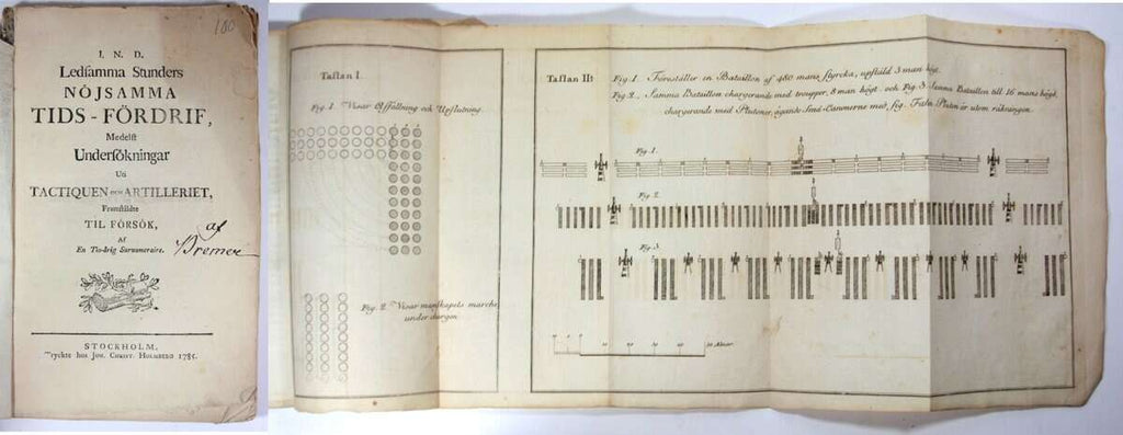 Ledsamma stunders nöjsamma tids-fördrif, medelst undersökningar uti tactiquen och artilleriet, framstäldte til försök, af en tio-årig surnumeraire är en fascinerande publikation från 1785 av Joh. Christ. Holmberg. Boken, som är häftad i pappersomslag, omfattar 75 sidor och en utvikbar plansch med två taflor. Trots att omslaget har stora pappersförluster, är inlagan i gott skick med endast några små lagerfläckar.