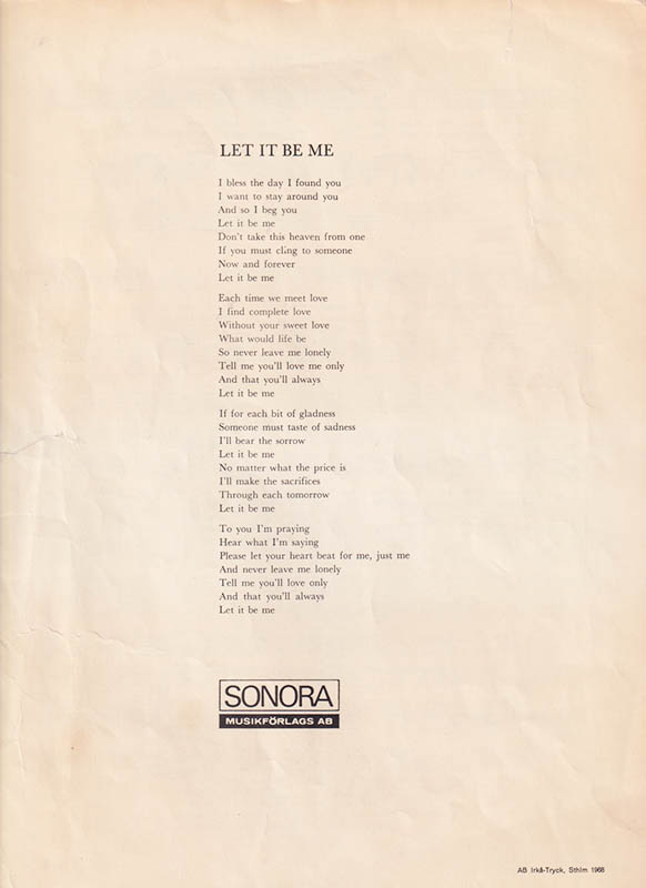 Denna musikpublikation, Let It Be Me (Je T'appartiens), utgiven av Sonora Musikförlags AB i Stockholm 1968, är en intressant del av popmusikens historia. Publikationen består av ett dubbelvikt ettbladstryck som illustreras med ett svartvitt fotografi av Lotta och Svenne. Måtten är 30,5 x 22,5 cm och den innehåller fyra lagade små revor med japanpapper, vilket ger en känsla av tidens hantverk och omsorg.