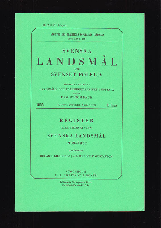 Register till Tidskriften Svenska Landsmål 1939-1952, utarbetad av Roland Liljefors och Herbert Gustavson, är en viktig publikation för den som studerar språk och lingvistik. Utgiven av P. A. Norstedt & Söner i Uppsala 1955, innehåller boken 56 sidor och är trådhäftad i mycket fint skick. Måtten är 24,5 x 16 cm och boken är ouppskuren, vilket gör den till ett utmärkt tillägg för samlare.