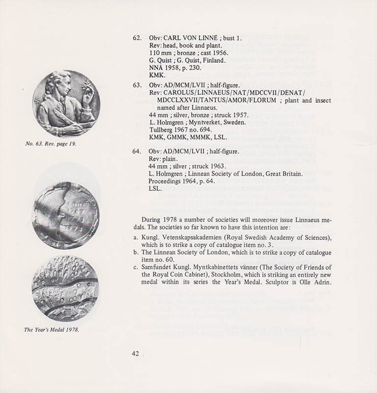 Denna publikation innehåller en omfattande katalog med 64 medaljer som representerar Linné och hans bidrag till botanik. Med hjälp av svartvita bilder visas medaljernas detaljer och konstnärliga utförande, vilket ger läsaren en djupare förståelse för Linnés inflytande inom numismatik och vetenskap.