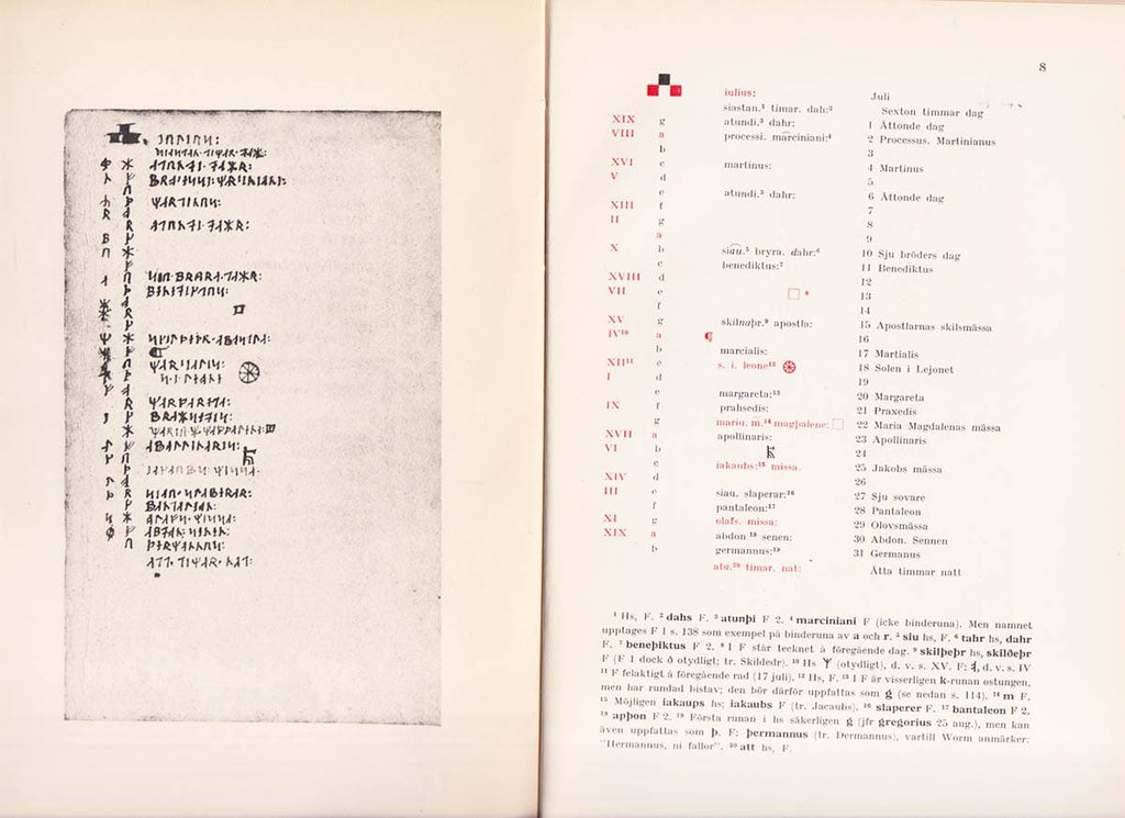 Ytterligare kapitel behandlar runkalenderns yttre beskaffenhet och dess innehåll. Det finns anmärkningar om helgonlängden och en analys av runornas utseende och ljudvärde, vilket ger en djupare förståelse för språkets utveckling under medeltiden. Boken avslutas med en ordförteckning och fragment av en gotländsk runkalender från 1572, vilket ytterligare berikar läsarens perspektiv på runologi och språkets historia.