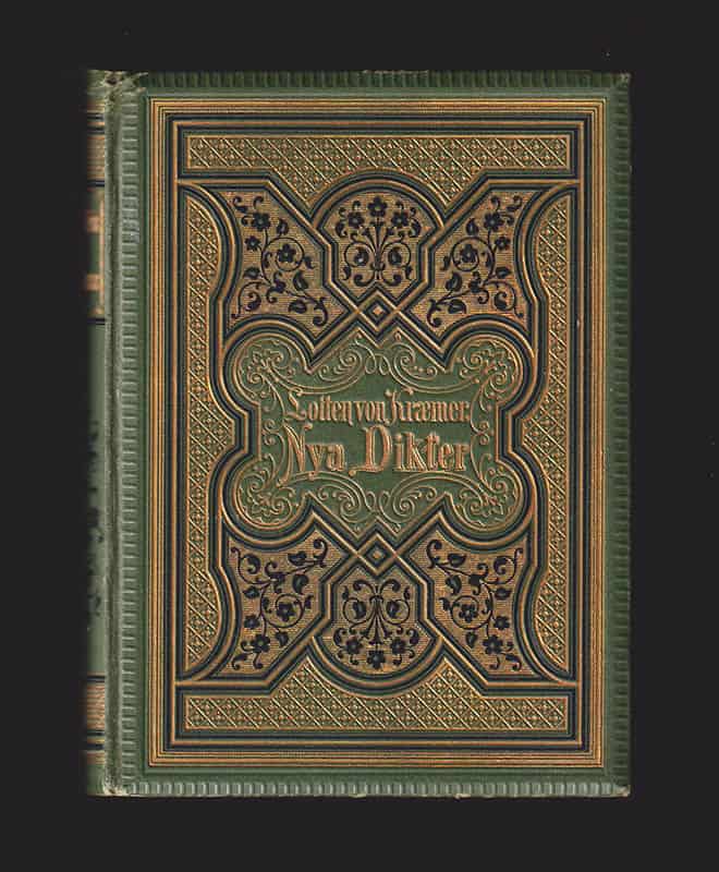 A. W. Björcks Förlag / Ivar Hæggströms Boktryckeri, Stockholm 1882. [8],215,[1 blank] sidor. Förlagets gröna präglade klotband med rik pärm- och ryggdekor i guld och svart samt helt guldsnitt [erikett: P. Herzogs bokbinderi Stockholm]. [17,5x13 cm]. Första och enda upplagan. Exlibris på främre pärms insida: G & G. Sjöberg. - Charlotta (Lotten) Lovisa von Kræmer, född 6 augusti 1828 på Djurgården i Stockholm, död 23 december 1912 i Engelbrekts församling, Stockholm, var en svensk författare, feminist, donator och filantrop. Hon är känd som instiftaren av Samfundet De Nio och Lotten von Kræmers pris är uppkallat efter henne. (från Wikipedia). Ämnesord: Skönlitteratur, Vitterhet