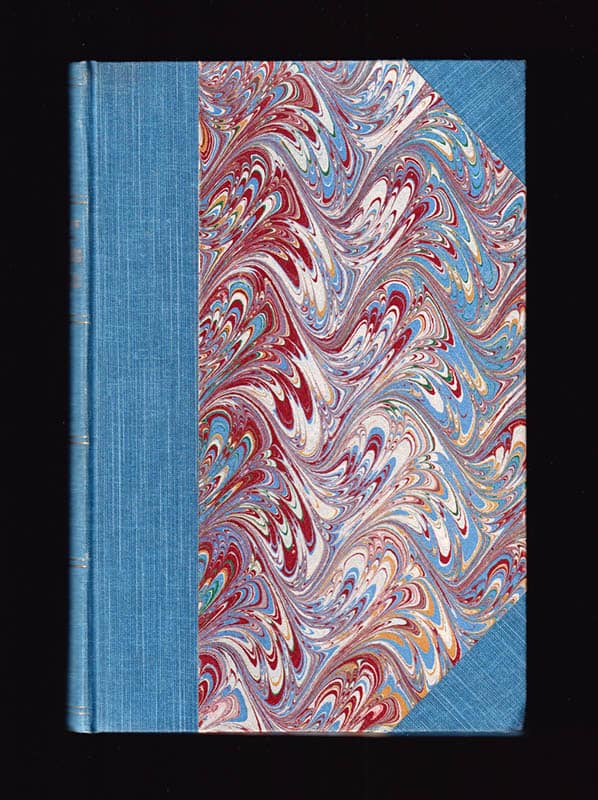 Boken är bunden i ett blått halvklotband med dekorativt marmorerat pärmpapper och förgylld ryggdekor, vilket ger den en elegant framtoning. De stänkmarmorerade snitten bidrar till den visuella attraktionen. Med måtten 19,5 x 13 cm är det en behändig volym. Den första upplagan har en äldre namnteckning på försättsbladet samt ett nummer skrivet på titelsidan, vilket ger boken en personlig touch och historia.