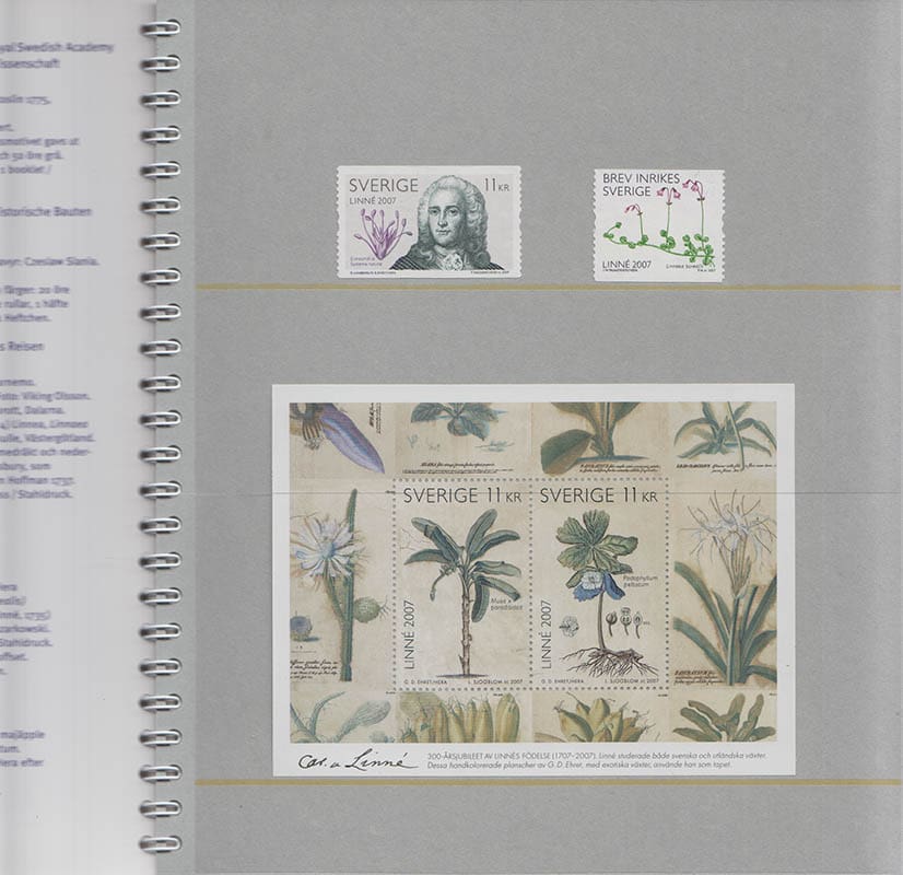 Med sina 24 sidor är Carl von Linné. En bok med frimärken (10 st) spiralbunden och levereras i en tryckt originalpappkassett. I boken ingår även ett löst bifogat häfte med sex frimärken graverade av Czeslaw Slania, med valören 1.30 kr, som beskriver Linnés resor. Boken är i fint skick och har ett totalt frankeringsvärde på cirka 48 kr. ISBN-numret är 9789197606325.