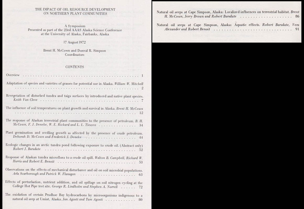 Denna samling, Proceedings of the Symposium on the Impact of Oil Resource Development on Northern Plant Communities, redigerad av Brent H. McCown och Donval R. Simpson, publicerades av Institute of Arctic Biology vid University of Alaska 1973. Boken är klammer- och limhäftad, med formatet 22,5x15 cm och är i bra skick.