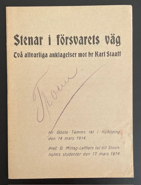 Information om Stenar i försvarets väg - två allvarliga anklagelser mot hr Karl Staaff. Hr Gösta Tamms tal i Nyköping den 14 mars 1914; prof. G. Mittag-Lefflers tal till Stockholms studenter den 17 mars 1914. av Mittag-Leffler, Gösta; Tamm, Gösta