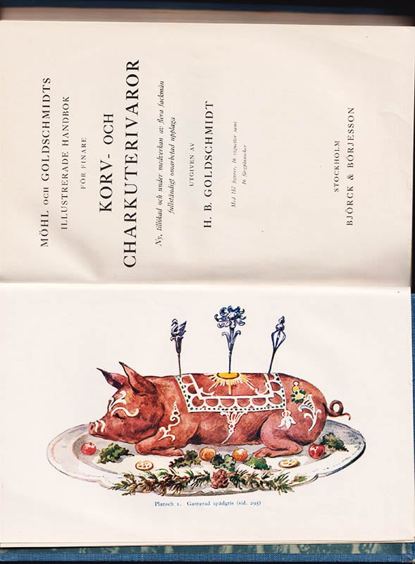 Information om Möhl och Goldschmidts illustrerade handbok för finare korv- och charkuterivaror. Med 157 figurer, 16 vignetter samt 16 färgplanscher av Möhl, Wilhelm ; Goldschmidt, H. B.