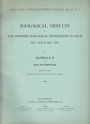 I Zoological results of the Swedish Zoological expeditions to Siam 1911-12 & 1914-1915. V. Mammals II presenterar Nils Gyldenstolpe en grundlig analys av däggdjursfaunan i Siam. Denna publikation, utgiven av Kungl. Vetenskapsakademien 1917, omfattar 59 sidor och innehåller sex fotografiska plattor med svartvita bilder som dokumenterar de studerade arterna.