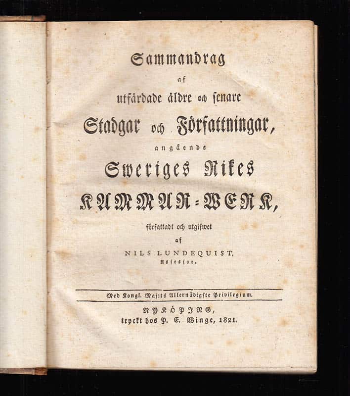 Information om Sammandrag af utfärdade äldre och senare stadgar och författningar, angående Sweriges rikes kammar-werk, författadt och utgifwet af Nils Lundequist. Assesor. Med kongl. maj:ts allernådigste privilegium av Nils Lundequist