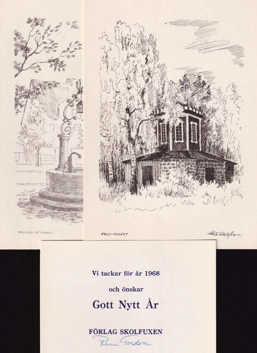 Som en extra detalj medföljer ett Gott Nytt År-kort från förlaget, undertecknat av Rune Gordon, vilket ger en personlig touch till denna samling. Mappen är i fint skick och utgör en uppskattad del av svensk lokalhistoria och konst.