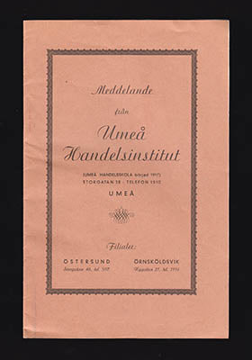 Boken är tryckt med originalomslag och mäter 23x15 cm, vilket gör den lätt att hantera. Den är publicerad utan angiven ort och år, vilket kan ge en känsla av tidlöshet. Umeå Handelsskola, som grundades 1917, står i fokus i denna skrift och erbjuder en historisk kontext för läsaren. Med sin klammerhäftade bindning är den lättillgänglig och bevarar sin integritet som en antikvarisk bok.