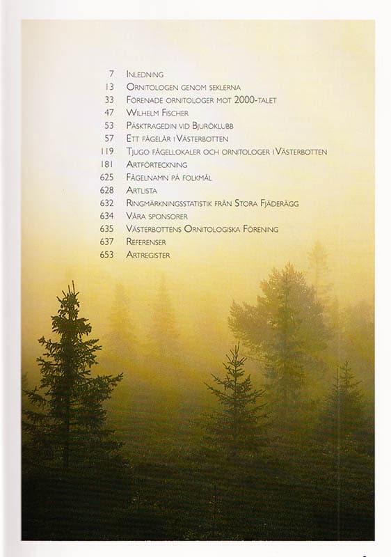 Boken är indelad i flera kapitel som belyser olika aspekter av fågellivet. Bland kapitlen finns Historik, Ett fågelår i Västerbotten, Tjugo fågellokaler och Fågelnamn på folkmål. Det mest omfattande avsnittet innehåller en detaljerad beskrivning av alla fågelarter som påträffats i Västerbotten, med rubrikerna Status, Förekomst och Historik. Detta avsnitt ger en unik insikt i fågelpopulationernas utveckling över tid, från de första noteringarna år 1695 fram till 1997.