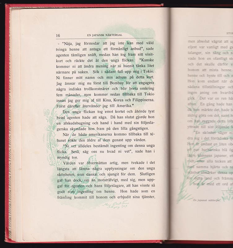 Watanna, en av de första nordamerikanska författarna av asiatisk härkomst, skriver med en röst som förenar orientalisk mystik och jugendstil. Översättningen av Hilda Löwenhielm gör texten tillgänglig för en bredare publik. Bokens klotband är prytt med en förgylld pärm- och ryggdekor, vilket ytterligare förstärker dess konstnärliga värde.