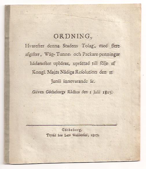 Information om Ordning, hvarefter denna stadens tolag, med flere afgifter, wåg-tunne- och packare-penningar hädanefter upbäras, upprättad till följe af Kongl. Maj:ts nådiga resolution den 11 junii innevarande år. Gifven Götheborgs Rådhus den 1 julii 1817. 1817. av