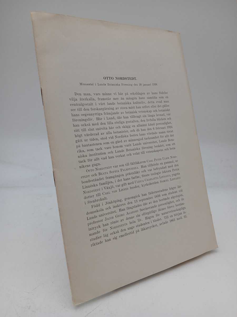 Otto Nordstedt: Minnestal i Lunds botaniska förening den 20 jan. 1938 är en hyllning till en centralgestalt inom svensk botanik. I detta minnestal framhävs Nordstedts betydelse för utvecklingen av botanisk forskning och utbildning i Sverige. Boken, som har ett omfång av 12 sidor, är klammerhäftad och i mycket fint antikvariskt skick.