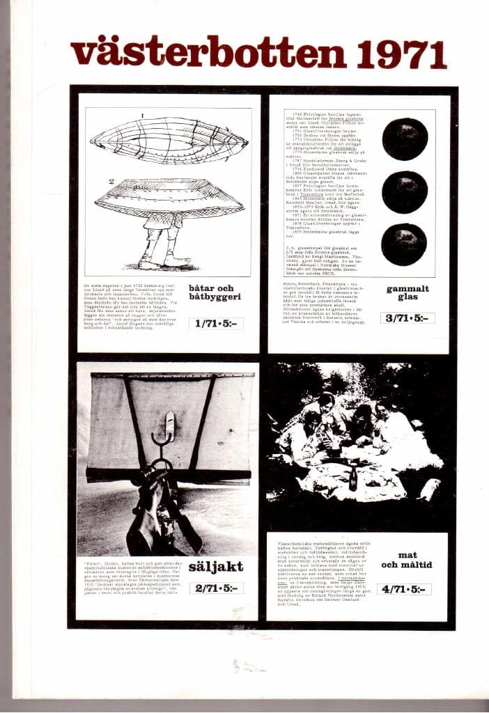 Västerbotten 1971 är en samling av tidskriftens fyra nummer från 1971, noggrant inbundna i ett band. Boken erbjuder en djupgående presentation av olika teman som präglade Västerbotten under det året. Teman som båtar och båtbyggeri, säljakt, gamla glas och mat och måltid utforskas med både text och illustrationer.