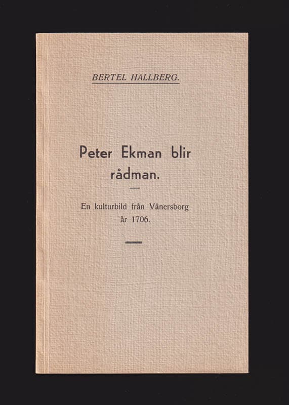Denna biografi, Peter Ekman blir rådman. En kulturbild från Vänersborg år 1706, ger en inblick i livet för Peter Danielsson Ekman, en framstående affärsman och rådman i Vänersborg under tidigt 1700-tal. Boken, utgiven av Länstryckeriet i Vänersborg år 1937, omfattar 34 sidor och är i fint skick, vilket gör den till ett intressant tillskott för samlare av svenska biografier.