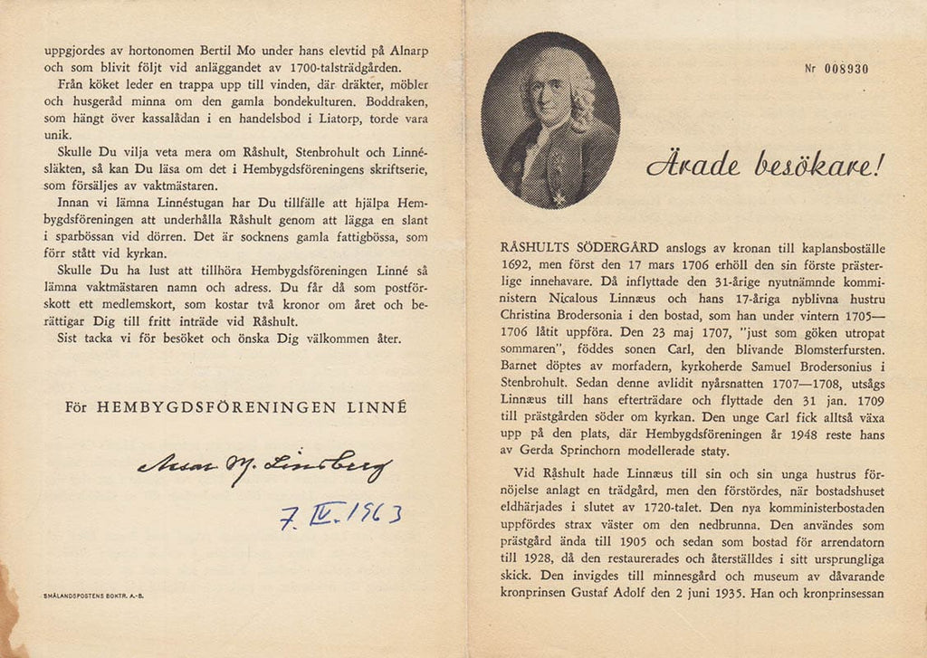 Ärade besökare! (Inträdesbiljett) är en intressant publikation som ger en inblick i Carl von Linnés liv och verk. Denna trycksak, som är utgiven av Hembygdsföreningen Linné, innehåller fyra sidor och är illustrerad med en bild av Linné själv. Den är en del av en samling som hedrar en av Sveriges mest kända botanister.