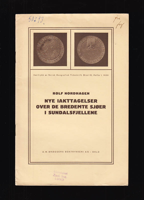 Rolf Nordhagen, född 21 oktober 1894 i Kristiania, var en betydande norsk botaniker vars arbete har haft stor inverkan på studier inom botanik. I denna publikation, som är ett särtryck från Norsk Geografisk Tidsskrift, presenterar han sina iakttagelser av växtlivet kring de bredemte sjöarna i Sundalsfjellene. Med författarens notering 'fra forf.' och stämpel från Zoologiska Institutionen i Lund, blir boken en intressant del av vetenskaplig litteratur.