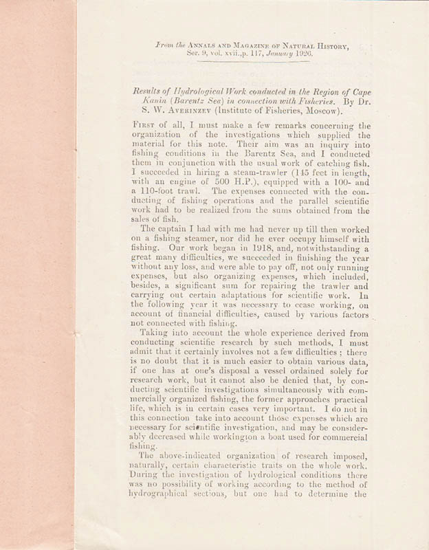 Boken Results of Hydrological Work conducted in the Region of Cape Kanin (Barentz Sea) in connection with Fisheries. (Institute of Fisheries, Moscow) behandlar resultatet av hydrologiskt arbete utfört i regionen Kap Kanin, som ligger vid Barentzhavet. Arbetet genomfördes i samband med fiske och publicerades ursprungligen i tidskriften Annals & Magazine of Natural History år 1926.