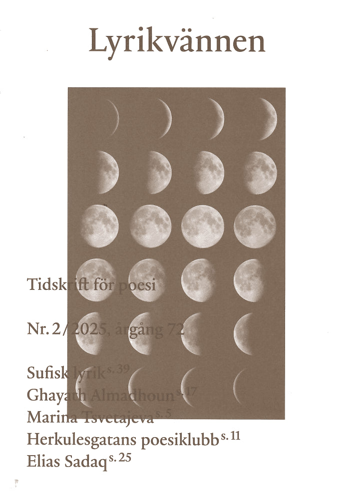 Innehåll: Sufisk lyrik, Ghayath Almadhoun, Marina Tsvetajeva, Herkulesgatans poesiklubb, Elis Sadaq m.fl  Kritik/Recensioner. häftad/softback, 80 sidor. Lyrikvännen (Malmö, 2025). Översättare: Alan Asaid och många andra.