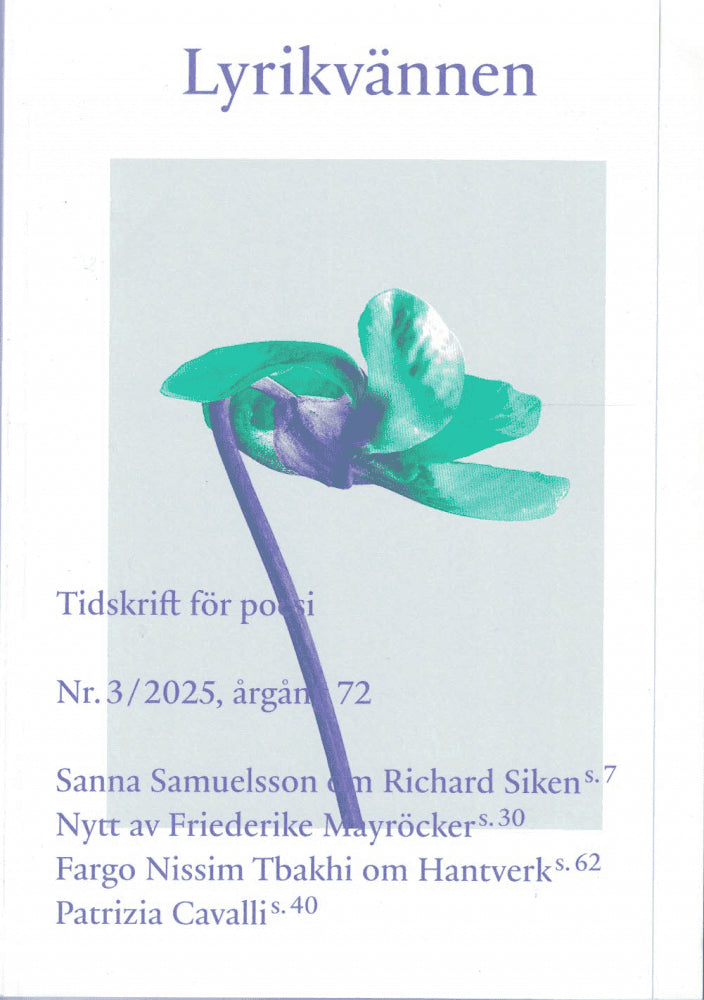 Lyrikvännen: ─ tidskrift för poesi. Nr 3 2025 erbjuder en samling av poesi från framstående namn som Friederike Mayröcker, Patrizia Cavalli och Lejla Cato. Tidskriften presenterar även bidrag av Olvido García Valdés, Duaa Kamel och Richie Hofmann. Denna utgåva innehåller dessutom texter av Fargo Nissim Tbakhi, Sanna Samuelsson och Henrik Sahl Johansson, vilket ger en mångfacetterad bild av den samtida poetiska scenen.