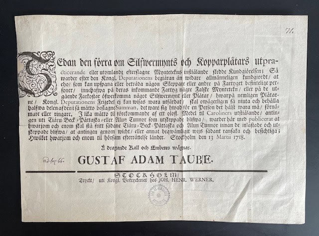 Denna unika publikation, Sedan den förra om silfwermynts och kopparplåtars utpracticerande eller utomlandz efterslagne myntetekns instiälande skedde kungiörelsen, utforskar viktiga aspekter av mynt och smuggling under 1700-talet. Tryckt i Stockholm av Johan Henrik Werner år 1718, erbjuder detta ettbladstryck en inblick i dåtidens numismatik och de utmaningar som samhället stod inför när det gällde penningförfalskning och nödmynt.