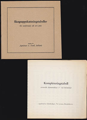 Utgivna av Jägmästare S. Troell, Sollefteå. Sollefteå 1952. [32] sidor. Klammerhäftad. [14,5x15 cm]. Ny upplaga [1944]. Medföljer: Kompleteringstabell avseende diameterklass 3” vid brösthöjd upprättad av distriktsjägm. Th. Larsson (Einar Thorsten), Örnsköldsvik. Sollefteå, [1952]. Vikt ettbladstryck. Två delar i fint skick.