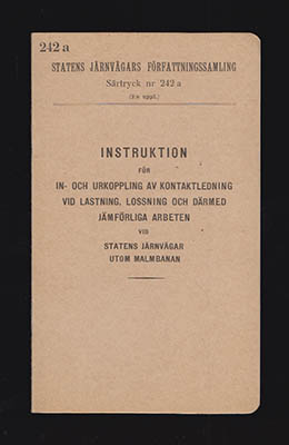 Instruktion: för in- och urkoppling av kontaktledning vid lastning, lossning och därmed jämförliga arbeten vid Statens järnvägar utom malmbanan är en praktisk handbok som publicerades den 1 februari 1938. Denna skrift, tryckt av K. L. Beckmans Boktryckeri, innehåller viktiga riktlinjer för säker hantering av kontaktledning inom järnvägssektorn.