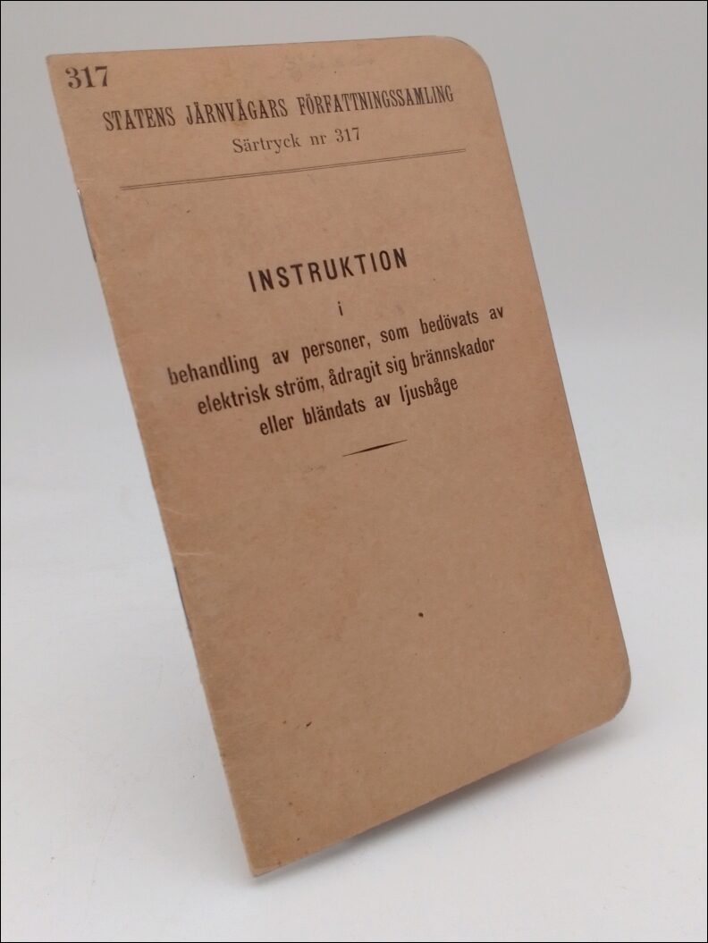 Denna skrift, Instruktion: i behandling av personer, som bedövats av elektrisk ström, ådragit sig brännskador eller bländats av ljusbåge, erbjuder en grundläggande vägledning för behandling av skador orsakade av elektrisk ström och relaterade olyckor. Utgiven av Statens Järnvägars Författningssamling och tryckt på K. L. Beckmans Boktryckeri, Stockholm, den 28 december 1940, består denna klammerhäftade publikation av 8 sidor med 5 textillustrationer.
