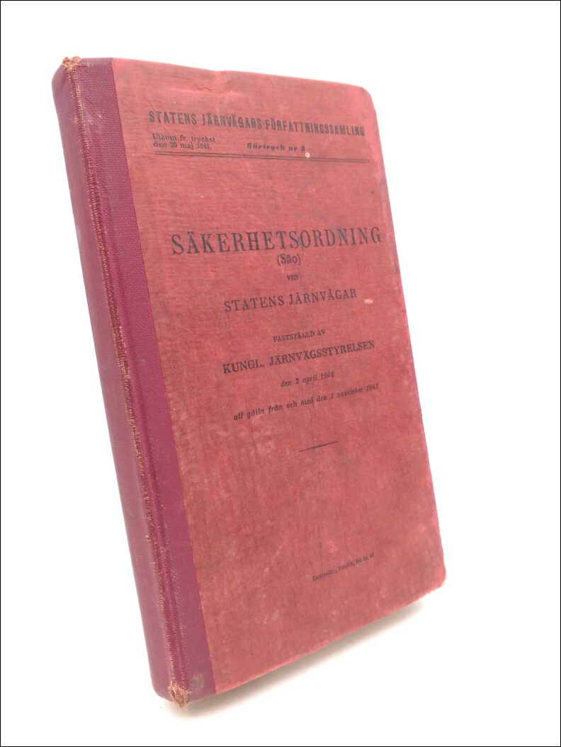 Säkerhetsordning: (Säo) vid Statens järnvägar är en viktig publikation som fastställdes av Kungl. Järnvägsstyrelsen den 3 april 1941. Boken, som omfattar 252 sidor, ger en detaljerad översikt av säkerhetsregler och föreskrifter som skulle gälla från och med 1 november 1941. Med sitt illustrerade halvklotband i normalt antikvariskt skick, erbjuder den en värdefull inblick i järnvägarnas säkerhetsprotokoll under en betydelsefull tid i svensk historia.