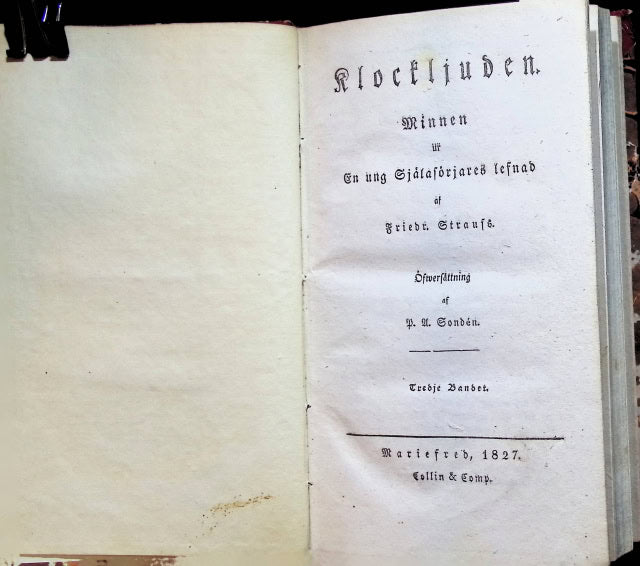 Klockljuden. Minnen ur en ung författares lefnad är en fascinerande skildring av Friedrich David Straufs liv och tankar. Utgiven 1827 i dekorativt förlagsband av Collin & Comp, ger denna bok en inblick i en ung författares upplevelser och reflektioner, som är nedtecknade i en tid präglad av stora förändringar.