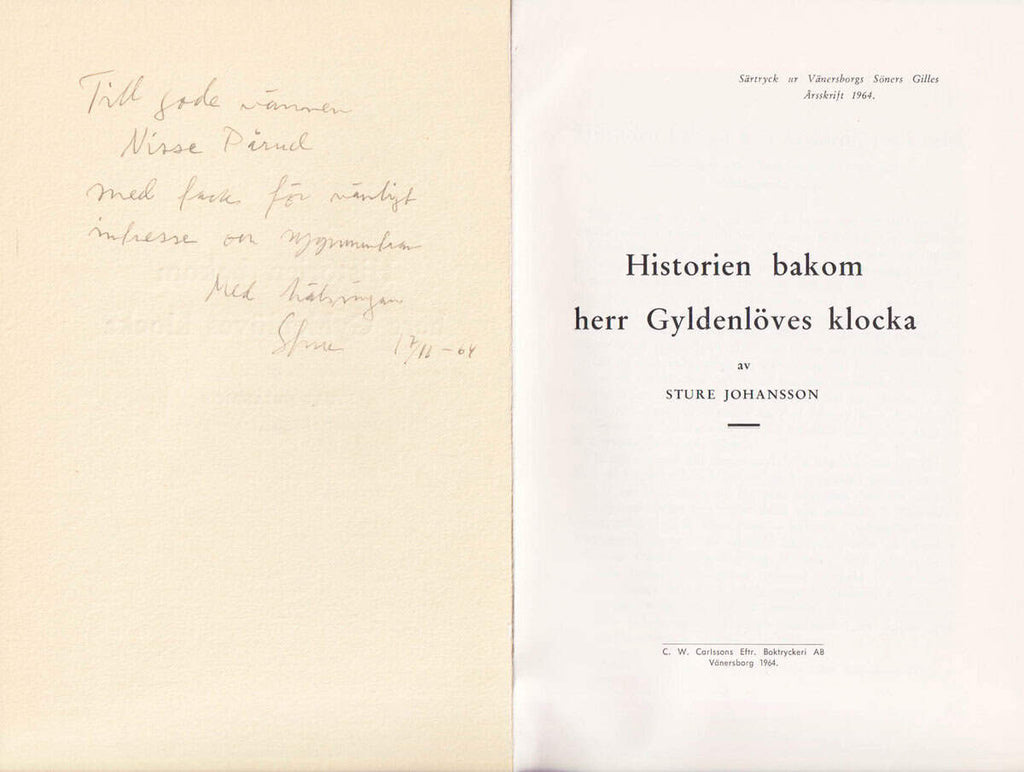 Information om Historien bakom herr Gyldenläves klocka. Anteckningar om Vänersborgs erövring och ödeläggande 1676 (dedikation) av Sture Johanson
