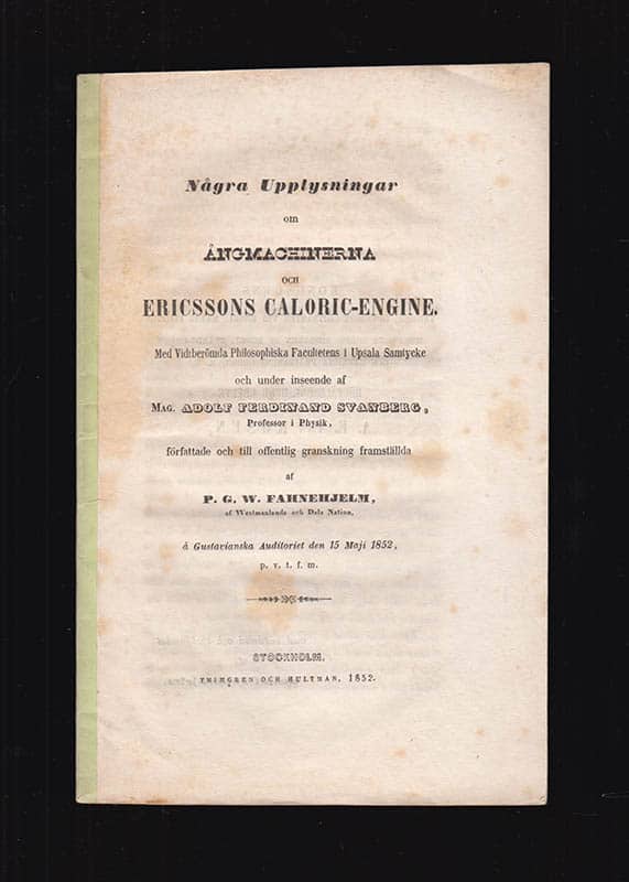 Några upplysningar om ångmachinerna och Ericssons caloric-engine är en betydelsefull akademisk avhandling som publicerades 1852 under ledning av mag. Adolf Ferdinand Svanberg, professor i fysik. Denna text är skriven av P. G. W. Fahnehjelm och presenterades vid Gustavianska auditoriet den 15 maj samma år. Boken fokuserar på teknik och ingenjörskonst, särskilt relaterat till ångmaskiner.