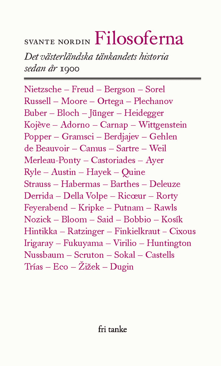 Svante Nordins bok Filosoferna: ─ det västerländska tänkandet sedan år 1900 erbjuder en djupgående analys av filosofins utveckling under det 20:e århundradet. Med sina 912 sidor ger den en omfattande bild av hur olika tankeströmningar har format vår moderna värld. Boken har belönats med Stora fackbokspriset 2011 och är det första bandet i en svit som utforskar filosofins historia.