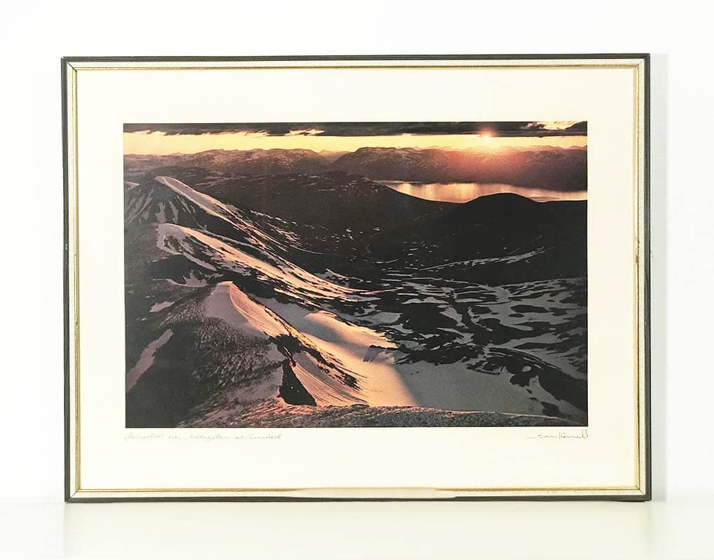Denna unika fotografiska samling, Midnattssol över Abiskofjällen och Torneträsk, är en hyllning till den storslagna naturen i Lappland. Fotografiet, som är ett original i färg och signerat av Sven Hörnell, fångar den majestätiska skönheten i fjällen och erbjuder en visuell upplevelse som sällan skådas. Med måtten 31x47 cm är detta verk både en konstnärlig och nostalgisk representation av den svenska naturen.