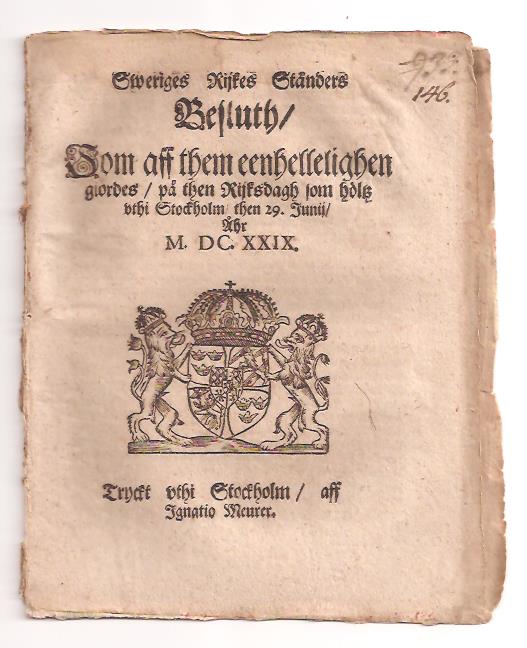 Information om Sweriges Rijkes Ständers Besluth, Som af them eenhelleligen giordes, på then Rijksdagh som höltz vthi Stockholm, then 29. Junij, Åhr M. DC. XXIX av