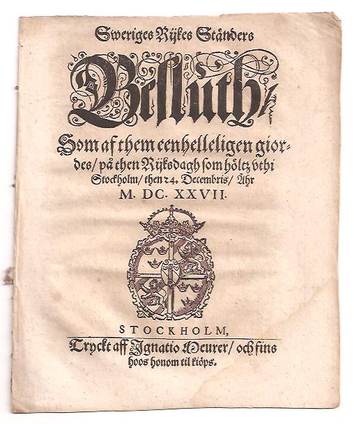 Information om Sweriges Rijkes Ständers Besluth, Som af them eenhellelighen giordes, på then Rijksdagh som höltz vthi Stockholm, then 24. Decembris, Åhr M.DC.XXVII av
