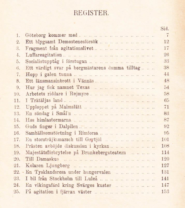 I På uppviglarstråt. Färdminnen av Texas får läsaren följa med på en fascinerande resa genom Sverige, där författaren Georg Frithiof Einar 'Texas' Ljungberg berättar om sina upplevelser från Göteborg till Luleå. Boken, utgiven av Frams Förlag 1919, skildrar hans engagemang för socialismen och hans arbete som agitator.