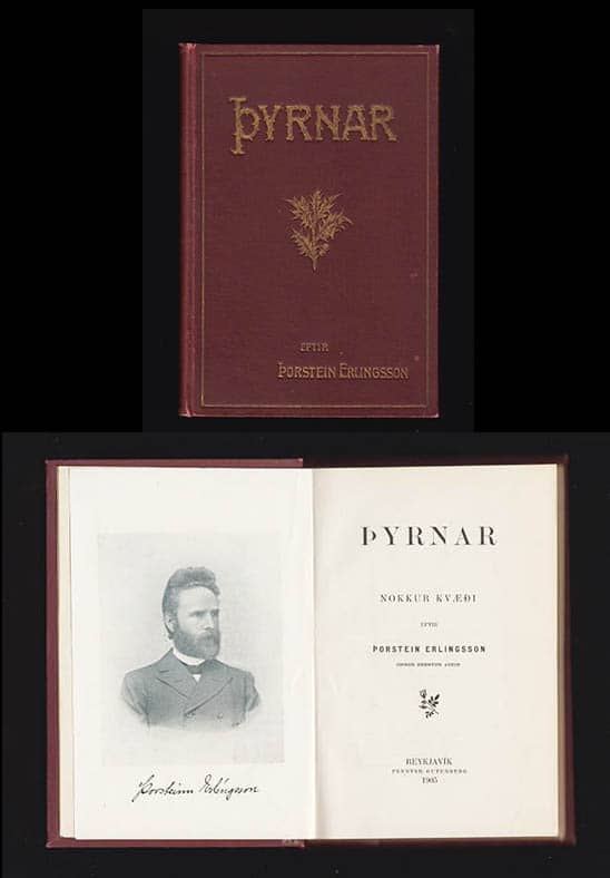 Gutenberg, Reykjavík 1905. Titelplansch [porträtt av Þorsteinn Erlingsson] + 244 sidor. Förlagets vinröda klotband med präglad, förgylld pärm- och ryggdekor. [19x13 cm]. 2. prentun aukin. Med tre prydliga namnteckningar på det fria försättsbladet. Gott skick. - Fiske Catalogue of the icelandic collection sid. 141.