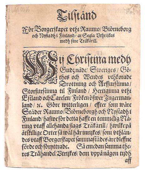 Information om Tilstånd för Borgerskapet vthi Raumo, Biörneborg och Nystadh i Finland, at segla Vthrijkes medh sine Träkärill av