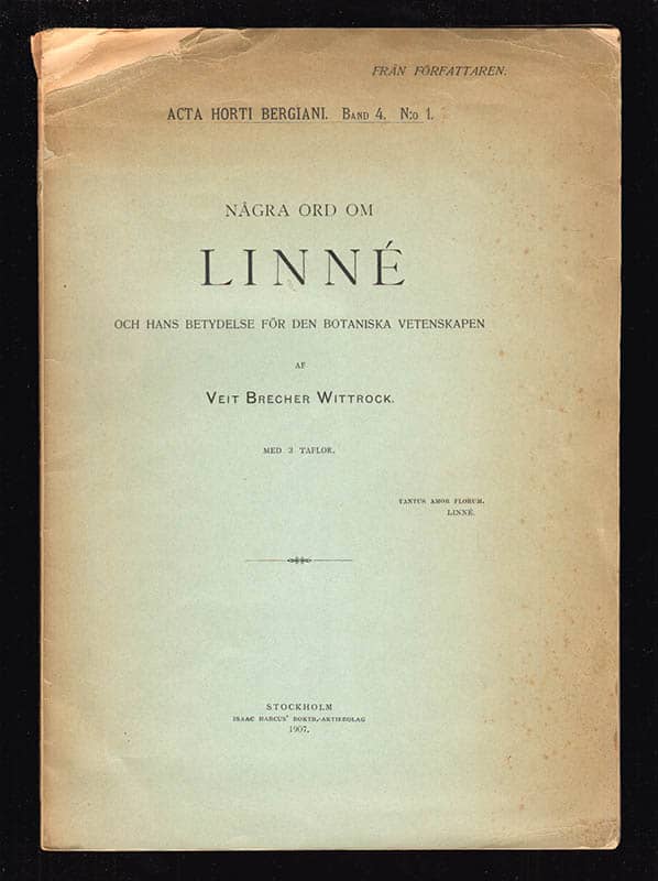 I Några ord om Linné och hans betydelse för den botaniska vetenskapen ger Veit Brecher Wittrock en insiktsfull översikt över Carl von Linnés liv och hans betydelse inom botanik. Denna skrift, utgiven 1907 med anledning av Linnéjubileet, omfattar 32 sidor och inkluderar tre svartvita planscher som porträtterar Linné vid olika åldrar: 30, 48 och 67 år.